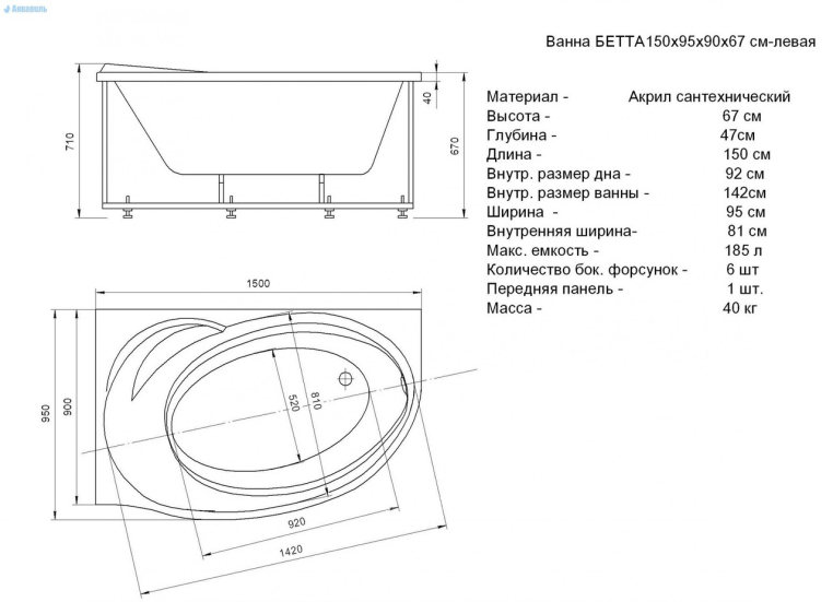 Акриловая ванна АКВАТЕК Бетта 150х95 BET150-0000009 с боковым гидромассажем Standard (пневмоуправление) и фронтальным экраном