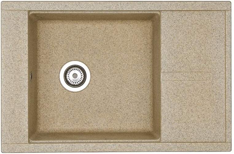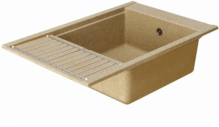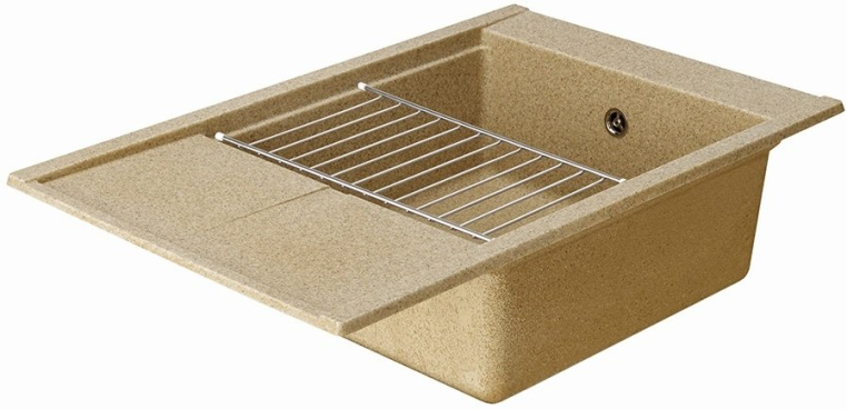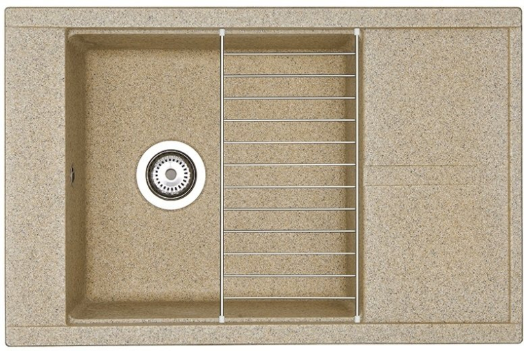 Кухонная мойка из литого мрамора в современном минималистичном дизайне с увеличенной глубокой чашей, крылом и дополнительным акссесуаром - решеткой из нержавеющей стали.