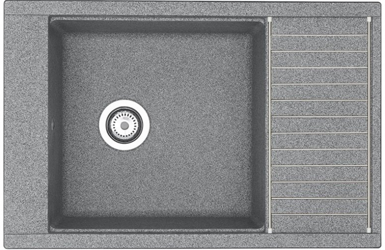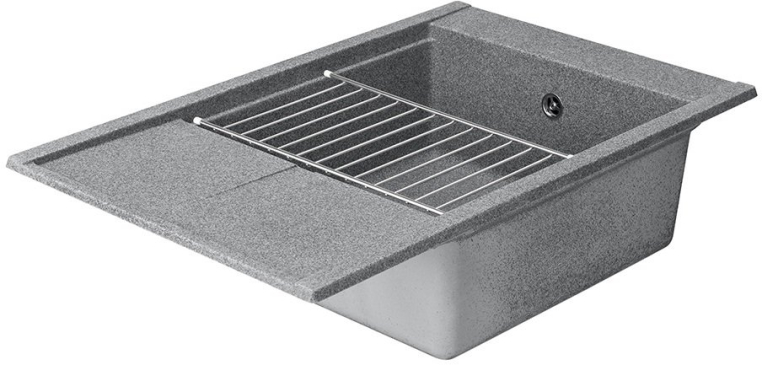 Кухонная мойка из литого мрамора в современном минималистичном дизайне с увеличенной глубокой чашей, крылом и дополнительным акссесуаром - решеткой из нержавеющей стали.