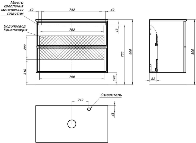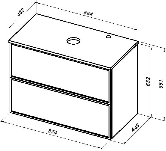 В столешнице Арт предусмотрены 2 отверстия: под слив раковины и под смеситель с установкой на столешницу. Расположение смесителя – справа от