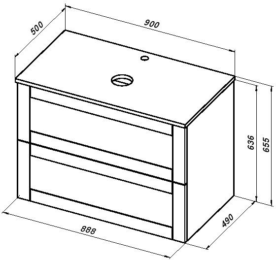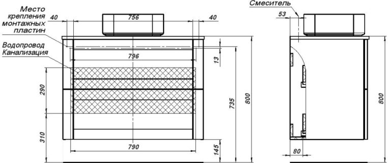 В столешнице Терра предусмотрены 2 отверстия: под слив раковины и под смеситель с установкой на столешницу. Расположение смесителя - за чашей раковины, по центру.
