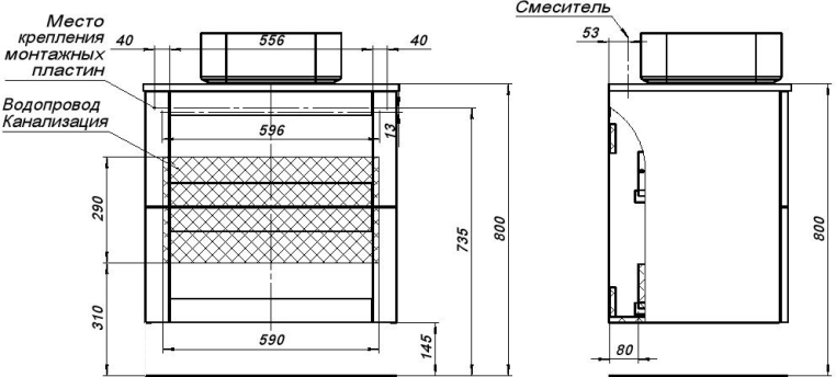 В столешнице Терра предусмотрены 2 отверстия: под слив раковины и под смеситель с установкой на столешницу. Расположение смесителя - за чашей раковины, по центру.