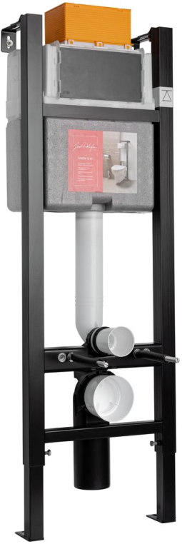Система инсталляции французской компании Jacob Delafon — надежная конструкция, оснащенная всем необходимым для установки и безупречного функционирования подвесного унитаза. Стальная рама регулируется по высоте с помощью изменения высоты ножек в пределах 20 см. Бачок толщиной 15 см выполнен из прочного полиэтилена и покрыт защитным чехолом от конденсата. Крепления с возможностью регулировки глубины монтажа позволяют установить систему инсталляции в угол.