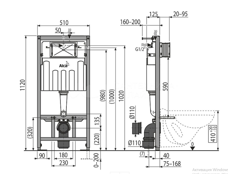 Монтажная глубина – 125 мм, со стоковым коленом – 160 мм.