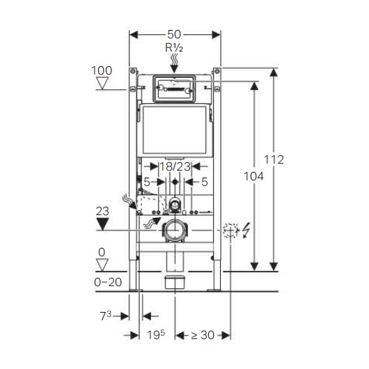 В комплект поставки входят угловой запорный вентиль R 1/2", совместим с MF, с кольцом-адаптером, защитная крышка для окна технического обслуживания, 2 держателя крепления рамки, комплект для подключения унитаза, соединительное колено, переходная муфта, резьбовые шпильки, защитные заглушки и набор крепежей. Панель смыва не входит в комплект поставки и приобретается отдельно.