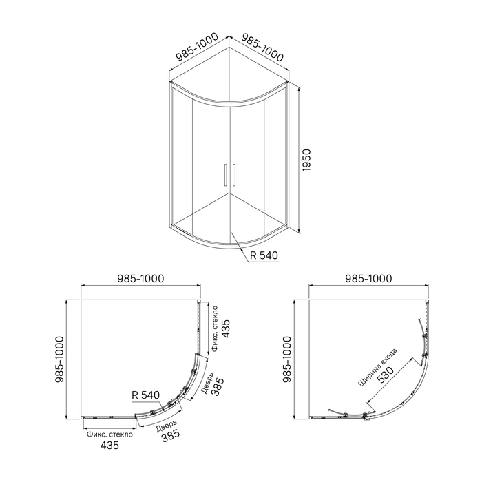 Душевое ограждение для ванной комнаты Zodiac в форме четверти круга с регулируемым размером 985-1000х985-1000х1950 мм, что позволяет сгладить неровности стен до 15 мм.