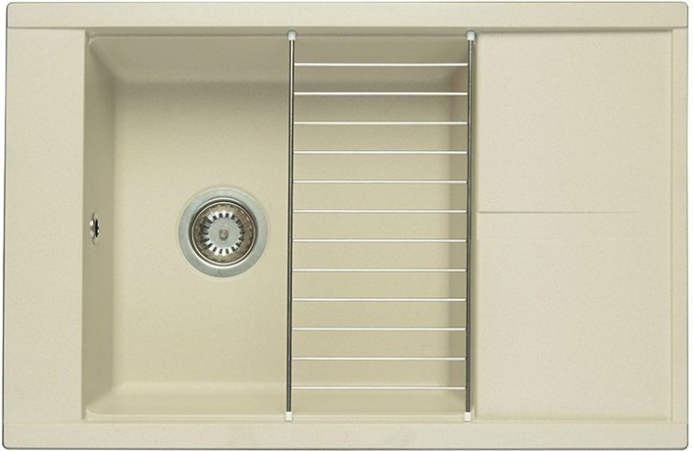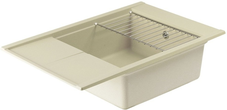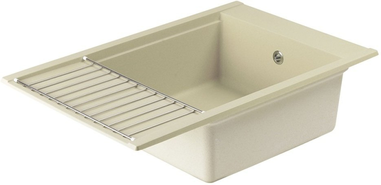Кухонная мойка из литого мрамора в современном минималистичном дизайне с увеличенной глубокой чашей, крылом и дополнительным акссесуаром - решеткой из нержавеющей стали.
