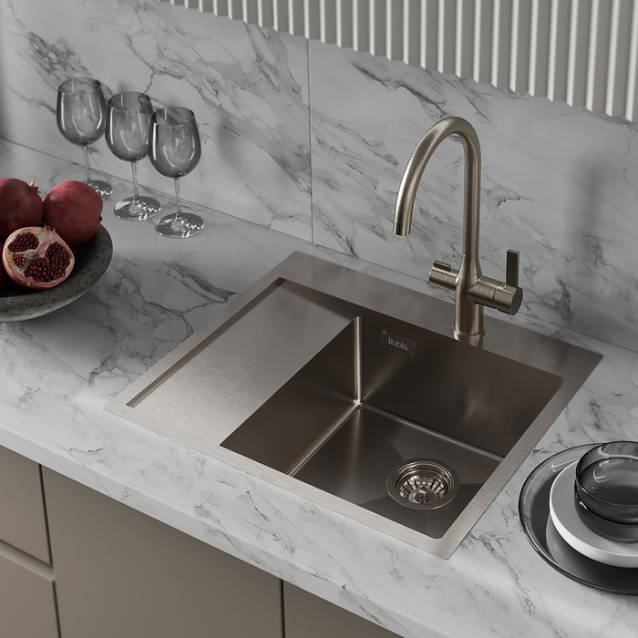 Мойки Haze отличаются современным дизайном и ручной технологией производства, что позволяет добиться идеальной геометрии – малый радиус закругления углов увеличивает рабочее пространство и помогает избежать «мертвых зон». Выполнение повседневных задач становится еще проще: в мойке удобно разместить большое количество посуды и мыть крупные предметы, такие как противень. Вместительное крыло слева от чаши возьмет на себя функцию сушки чистой посуды, а плоский сифон поможет сэкономить полезное пространство. Подходит для кухонных тумб от 45 см.