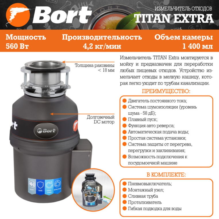 Линейка кухонных измельчителей Борт с двигателями постоянного тока пополнилась моделью TITAN Extra, которая имеет идентичную с TITAN 5000 мощность, производительность, объем рабочей камеры и количество ступеней измельчения: 560 Вт, 5,2 кг/мин, 1450 л, 3 ступени соответственно. Изменения не коснулись и материала рабочих элементов, камеры – это все та же высококачественная нержавеющая сталь. Полная шумоизоляция, защита от заклинивания и перегрузок – все эти преимущества присутствуют здесь! А также ряд существенных доработок: