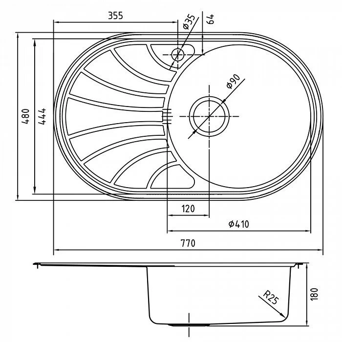 Комплектация: уплотнительная прокладка, крепления; Размер мойки: 770х480 мм; Сталь: нержавеющая, 0,8 мм; Ширина шкафа: от 45 см; Глубина чаши: 180 мм