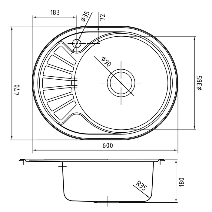Комплектация: уплотнительная прокладка, крепления; Размер мойки: 600х470 мм; Сталь: нержавеющая, 0,8 мм; Ширина шкафа: от 45 см; Глубина чаши: 180 мм