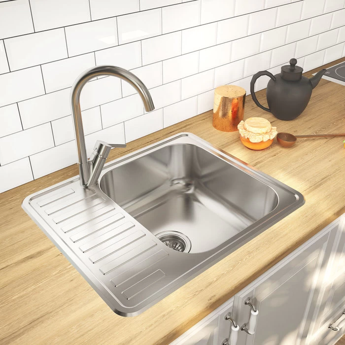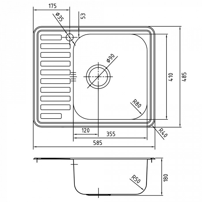 Комплектация: уплотнительная прокладка, крепления ; Размер мойки: 585х485 мм; Сталь: нержавеющая, 0,8 мм; Ширина шкафа: от 45 см; Глубина чаши: 180 мм
