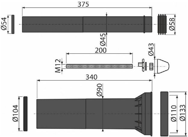 Патрубок сливной для подключения подвесного унитаза к стокам, полипропилен, Ø90 мм, с прокладками