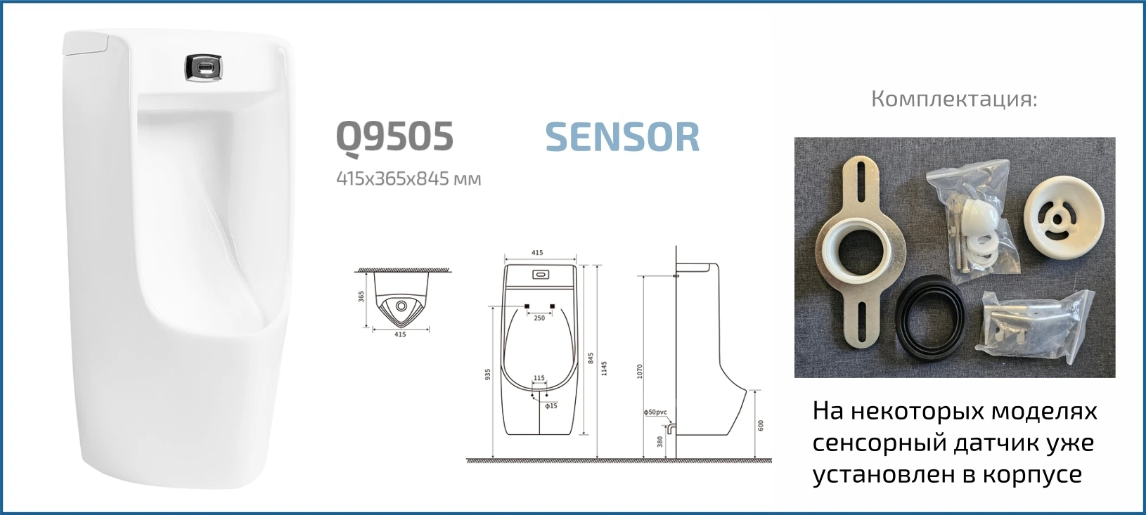 Ссылка на СЕРТИФИКАТ СООТВЕТСТВИЯ на электрику (https://gid.com.ru/thumb/2/E0XPe2hetiGZjo-wcUssZw/r/d/dobrovolnyj_sertifikat.jpg) — Ссылка на инструкции и схемы (https://cloud.mail.ru/public/9WUM/oWPbGt8Nj) — Publico — коллекция писсуаров, выполненная в строгом и лаконичном дизайне. Испанское качество и европейские стандарты соответствуют самым высоким требованиям эксплуатации. Подвесной сенсорный писсуар GiD Q9505 изготовлен из высококачественной керамики с белоснежным глянцевым покрытием, что придает ему современный и элегантный вид. Благодаря бесконтактному управлению устройство обеспечивает гигиеничность и удобство использования, автоматически активируя смыв при обнаружении пользователя. Скрытый подвод воды и настенный монтаж позволяют экономить пространство и облегчают уборку, делая эту модель идеальной для современных ванных комнат и общественных туалетов.