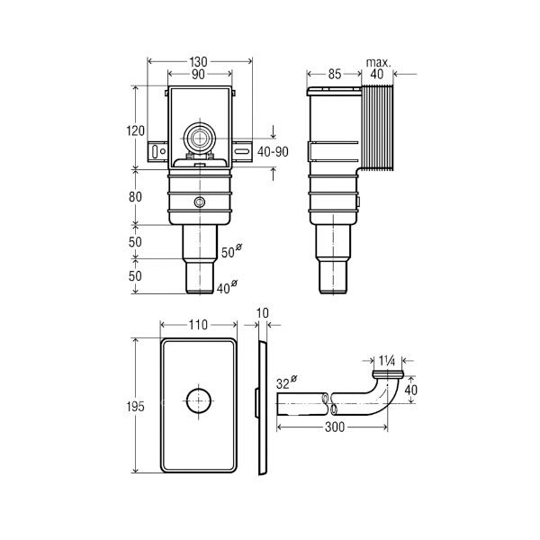 Сифон для скрытого монтажа, с защитной крышкой пластик/хром, горизонт. отвод, регулируемая высота, соединит. колено латунь/хром, 1 1/4 х 50/40