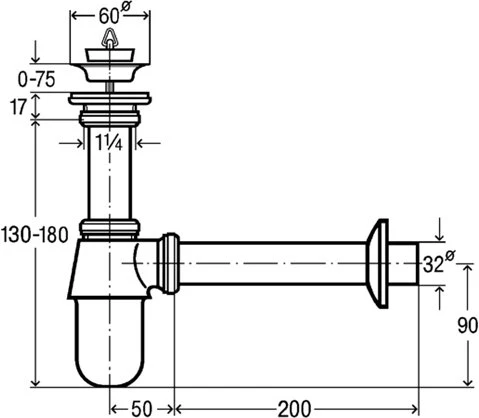 С пробкой, 1 1/4 x 32, хром, разъемная чашка выпуска, хромированная латунь.