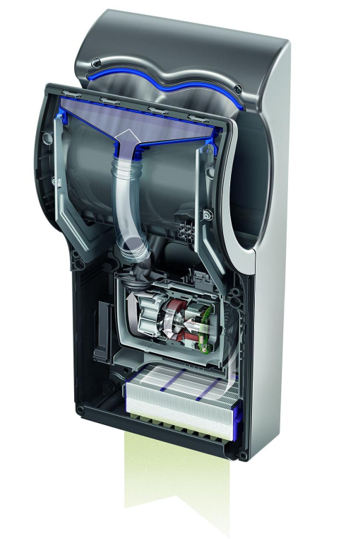 Другие сушилки для рук негигиеничны. Они не способны улавливать бактерии из воздуха туалетной комнаты. Они засасывают загрязненный воздух и выдувают его на руки. В сушилке для рук Dyson Airblade Mk2 используется фильтр HEPA класса H13. Задерживаются 99,9 % бактерий и микробов в воздухе туалетной комнаты. Таким образом, высушивание рук осуществляется при помощи чистого, а не грязного воздуха.