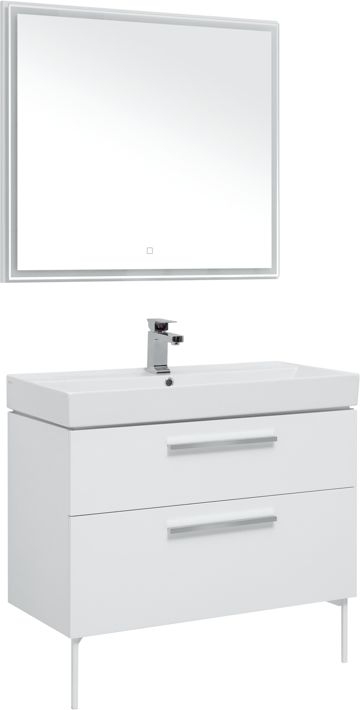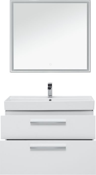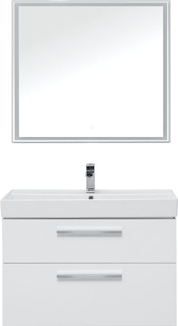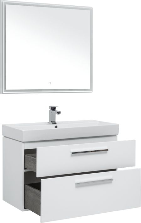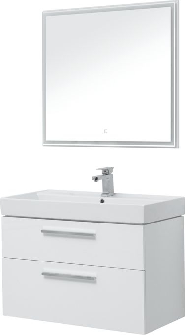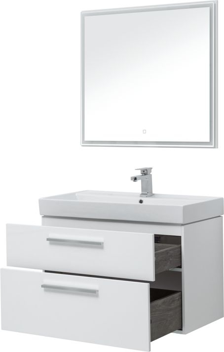 Мебель для ванной Aquanet Nova 90 в белом глянце изготовлена из влагостойкой ламинированной древесно-стружечной плиты и предназначена для использования в помещениях с повышенной влажностью. Тумбу Nova можно повесить на стену или установить ее на ножки. Для этого их необходимо приобрести дополнительно. Причем, есть выбор: купить белые ножки или черные матовые. В комплекте с тумбой - встраиваемая керамическая раковина «Латина». Эта модель выпускается исключительно для мебели Aquanet. Чаша раковины внутри имеет обтекаемую форму и небольшую платформу с отверстием для смесителя. На нее можно поставить гигиенические принадлежности. Ящики тумбы оборудованы надежными направляющими Hettich Quadro Silent System, которые обеспечивают полное выдвижение. Направляющие с доводчиками, так что при открывании и закрывании ящикам обеспечен плавный ход и отсутствие неприятных стуков. Ручки не входят в комплект, их необходимо приобрести дополнительно, выбрав на свой вкус из четырех доступных цветов: хром глянцевый, хром матовый, черный матовый и белый матовый. В комплекте зеркало с LED-подсветкой по периметру, которая включается с помощью сенсора.