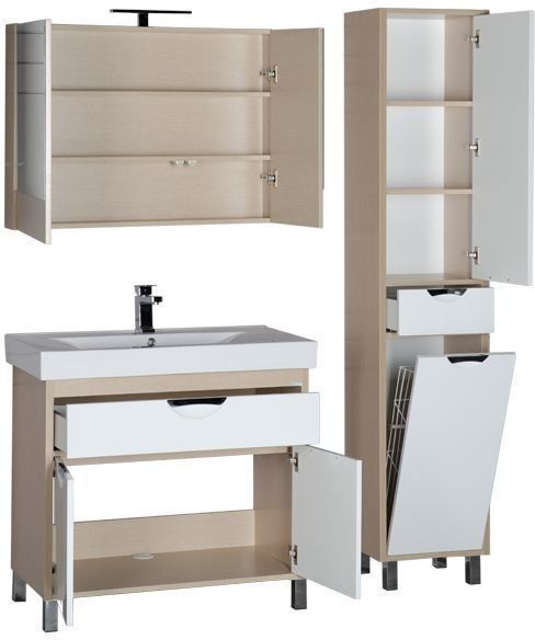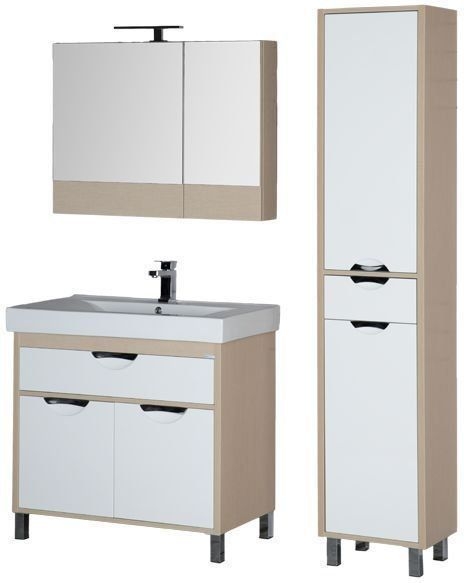 Функциональный комплект для ванной комнаты Акванет Гретта 90 придется по вкусу ценителям экстравагантных и модных интерьеров. Свежий взгляд на привычные формы превратил типичный набор предметов мебели в эффектный гарнитур в стиле «модерн». Оригинальные ручки ящиков и шкафов сразу выделяют «Гретту» и придают комплекту причудливый ретро-футуристический вид. В напольной тумбе предусмотрено большое отделение с распашными дверцами и широкий ящик под раковиной-столешницей. Настенное зеркало также представляет собой компактный шкаф, в котором традиционно размещают лекарственные и гигиенические средства. Светильник для зеркального шкафчика, который приобретается отдельно, решит проблему дополнительного освещения в ванной комнате. Дополните комплект высоким напольным пеналом и ваша ванная комната обретет законченный, стильный вид.