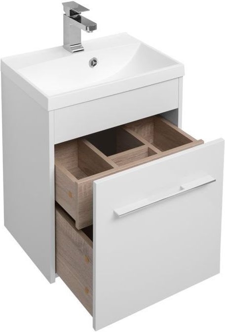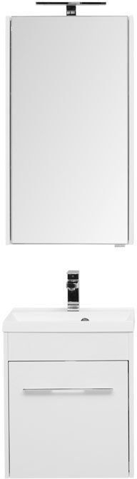 Комплект мебели для ванной Aquanet Августа 50 белого цвета отличает простота дизайна вкупе с функциональностью элементов. Корпуса как для тумбы, так и для зеркального шкафа, выполнены из ламинированного влагостойкого ДСП, а фасады - из МДФ, покрытого белой краской в несколько слоев. У тумбы один ящик, но он с секретом. Внутри скрыт еще один, неглубокий, но очень удобный, разделенный на несколько отделений, где удобно хранить разнообразную мелочевку. Механизм открывания снабжен доводчиками, ручки турецкой фирмы Systems. Тумба комплектуется раковиной из литьевого мрамора Нота new производства партнеров Aquanet компании «Цвет и стиль». Удобная зона хранения скрыта за зеркальной дверцей подвесного шкафчика высотой 90 см и шириной 50 см. Он имеет один зеркальный фасад. Для подвешивания изделий предусмотрена надежная фурнитура немецкой компании Hafele.