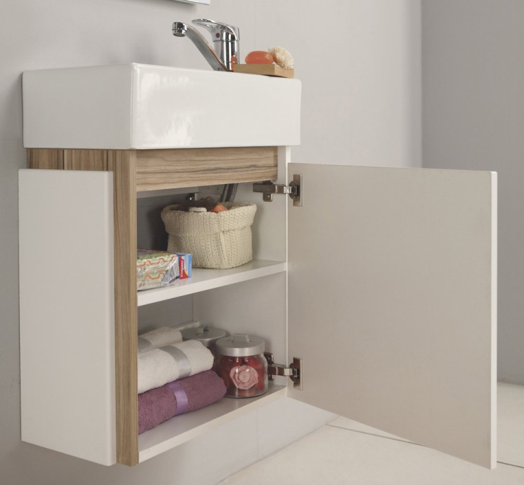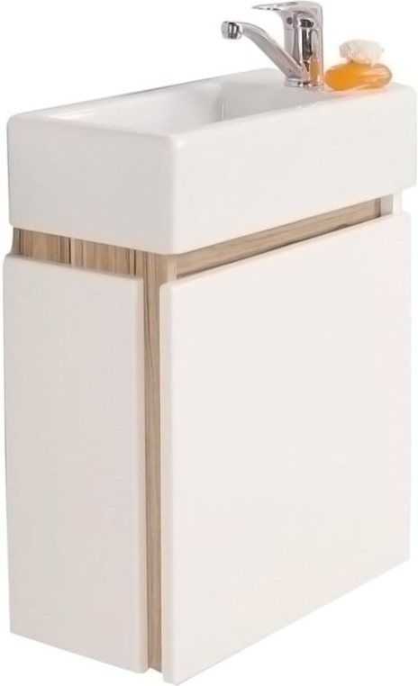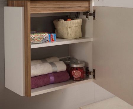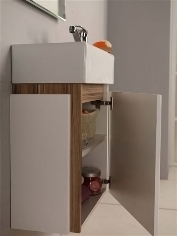 Мебель для ванной Акватон Эклипс М – отличный вариант для маленьких ванных комнат. Подвесная тумба компактна и эргономична, подвешивается на стену и экономит пространство. Несмотря на небольшой размер, раковина в ней глубокая и удобная. Распашной фасад на доводчиках плавного закрывания. Внутреннее пространство тумбы разделено полкой и подходит для хранения бытовой химии. Вертикальное зеркало способно визуально расширить помещение, а встроенная декоративная подсветка станет дополнительным источником освещения ванной комнаты. Подвесная тумба дополнена белыми глянцевыми накладками, благодаря которым открывается без ручки