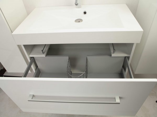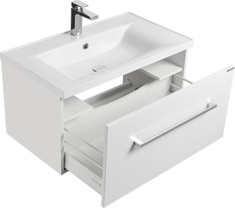Мебель для ванной комнаты из коллекции «Акватон Мадрид» поможет вам эргономично организовать пространство ванной комнаты. Центром коллекции является тумба шириной 80 см с ящиком, оснащенным механизмом доводчика и антискользящим ковриком. Дополнительно она оборудована полочками с двойным рейлингом, расположенными над ящиком. Усовершенствованные направляющие могут выдерживать большую нагрузку, перекосы при этом исключены. Подвесной монтаж стал проще: предусмотрена возможность подключения коммуникаций не только в стену, но в пол.Кроме того, имеется финский сифон, учитывающий особенности конструкции тумбы. Зеркальный шкаф оснащен подсветкой и антизапотевателем