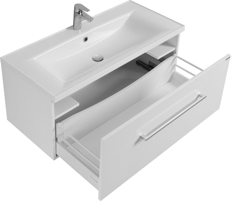Мебель из коллекции «Мадрид» идеально подходит для оформления современной ванной комнаты. Минималистичный стиль сочетается с функциональностью. Тумба с выдвижным ящиком оснащена доводчиками, гарантирующими бесшумное закрывание. Также она снабжена полочками с рейлингом, расположенными над ящиком. Современные направляющие механизмы полного выдвижения с металлическими боковинами обеспечивают амортизацию при закрывании, синхронизацию, исключающую перекосы даже нагруженного ящика, возможность выдерживать значительную нагрузку. Благодаря возможности вывода труб водопровода и канализации в пол подвесной монтаж мебели значительно упрощен. Кроме того, в комплект входит финский сифон, подобранный специально под конструкцию тумбы