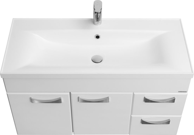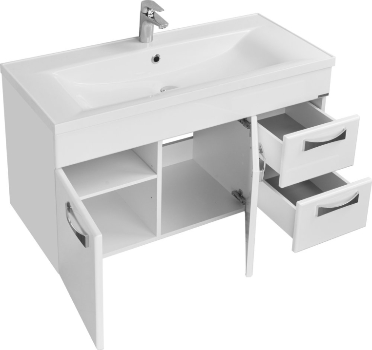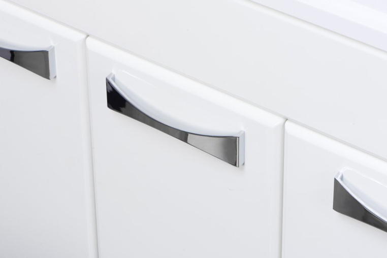 Яркий дизайн, построенный на гармоничных контрастах и игре цвета, отличает коллекцию мебели для ванной комнаты «Диор». Гарнитур строгой прямоугольной формы комплектуется изящной хромовой фурнитурой. Корпусы мебели изготовлены из ламинированной ДСП, фасады – из выкрашенной белой эмалью МДФ. Глянцевые поверхности просты в уходе: чтобы избавиться от пыли и брызг, их достаточно протереть салфеткой. За распашными дверцами находится ниша для больших предметов, а справа два удобных выдвижных ящика. В тумбу встроена широкая и глубокая прямоугольная раковина из искусственного мрамора.Зеркало оснащено подсветкой. Система ANTI-STEAM предотвращает запотевание отражающей поверхности в условиях влажной среды. Для хранения полотенец и бытовой химии служит дополнительный шкаф-колонна