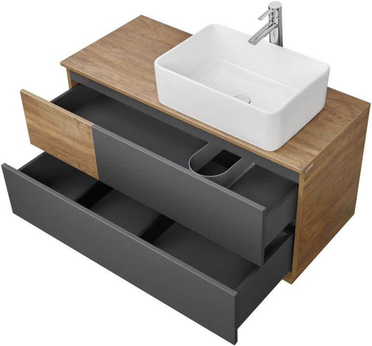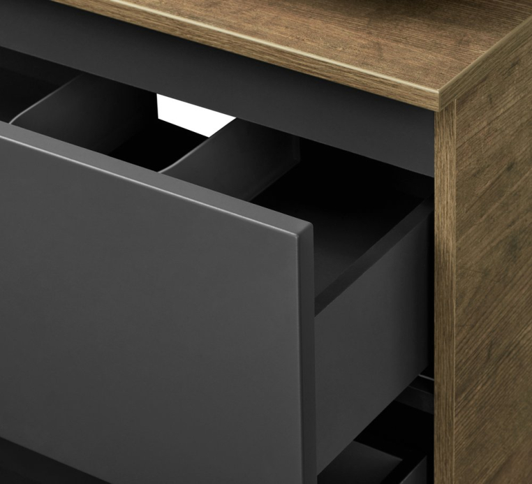 Тумба умывальник состоит из двух вместительных ящиков, открывающихся с помощью системы push-to-open, нижний ящик комплектуется системой организации пространства, которая препятствует смещению мелких косметических и гигиенических средств Интегрированная по бокам зеркального полотна подсветка с мягким, рассеянным светом, идеальна для комфортных утренних процедур и макияжа, а используемые в подсветке светодиоды, экономят до 50% потребляемой мощности и служат в 2 раза дольше люминесцентных ламп