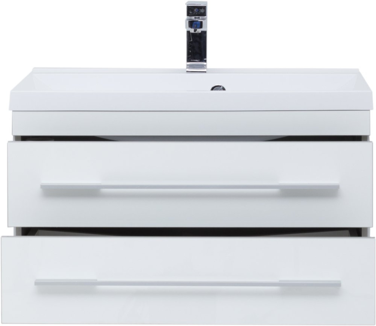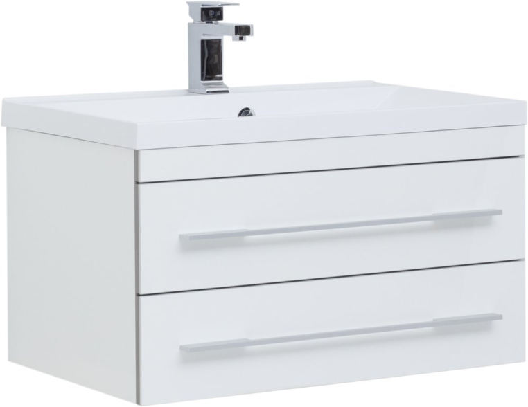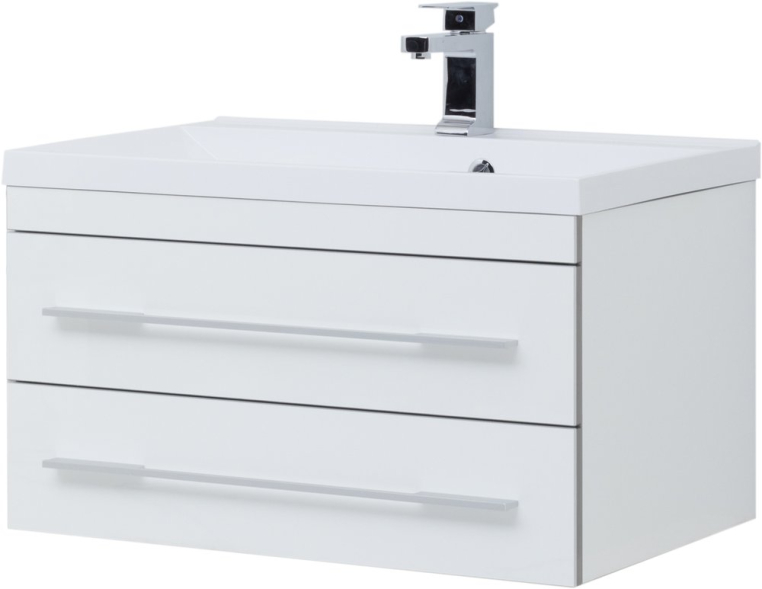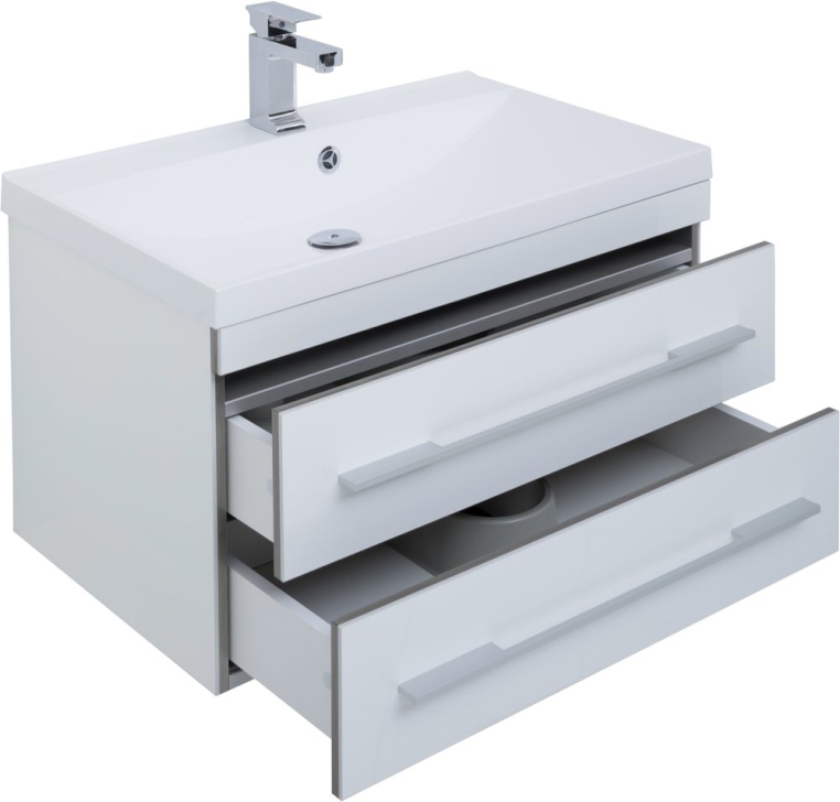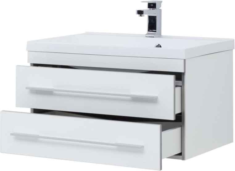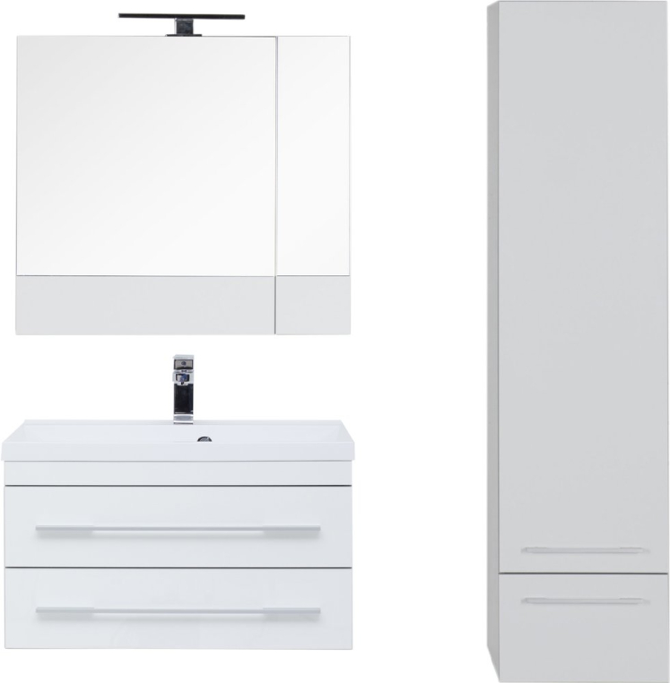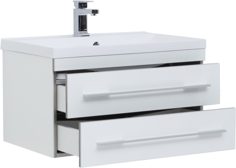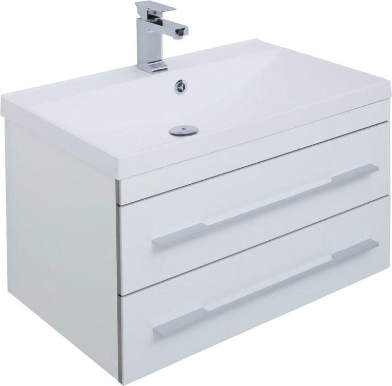 Современный сдержанный дизайн, качественная отделка из акрила, комфортная функциональность – достоинства мебели для ванной из коллекции «Верона» от российского производителя Aquanet. Раковина из искусственного мрамора устанавливается на тумбе из влагостойкой ДСП, обработанной глянцевым акрилом. Подвесной монтаж изделия позволяет дополнительно комплектовать мебельный гарнитур подкатной тумбой, которую можно поместить под навесной моделью и использовать как подставку или даже сиденье. Вместе навесная и напольная модели предоставляют широкую зону хранения. Горизонтальные хромированные ручки на фасаде тумбы и прямоугольное зеркало «Верона» со скрытым шкафчиком дополняют авангардный образ коллекции