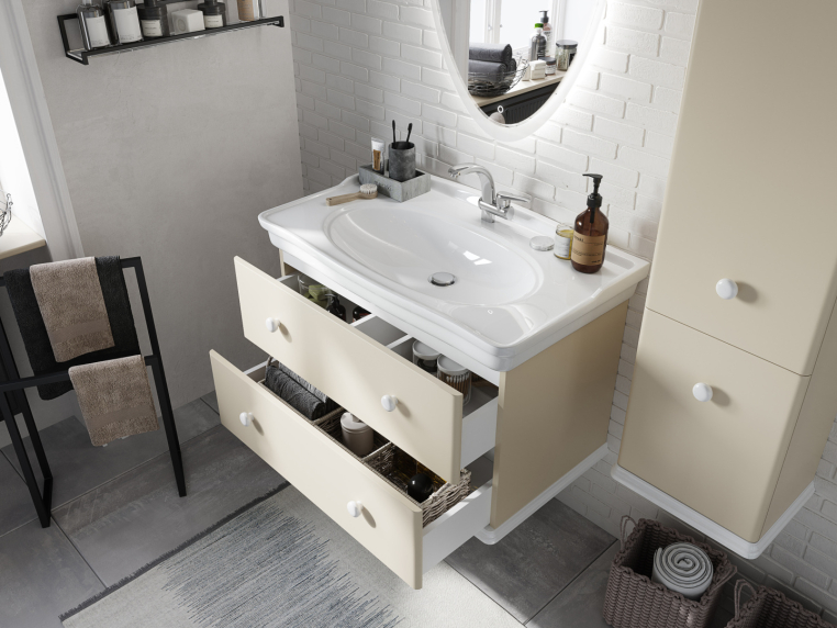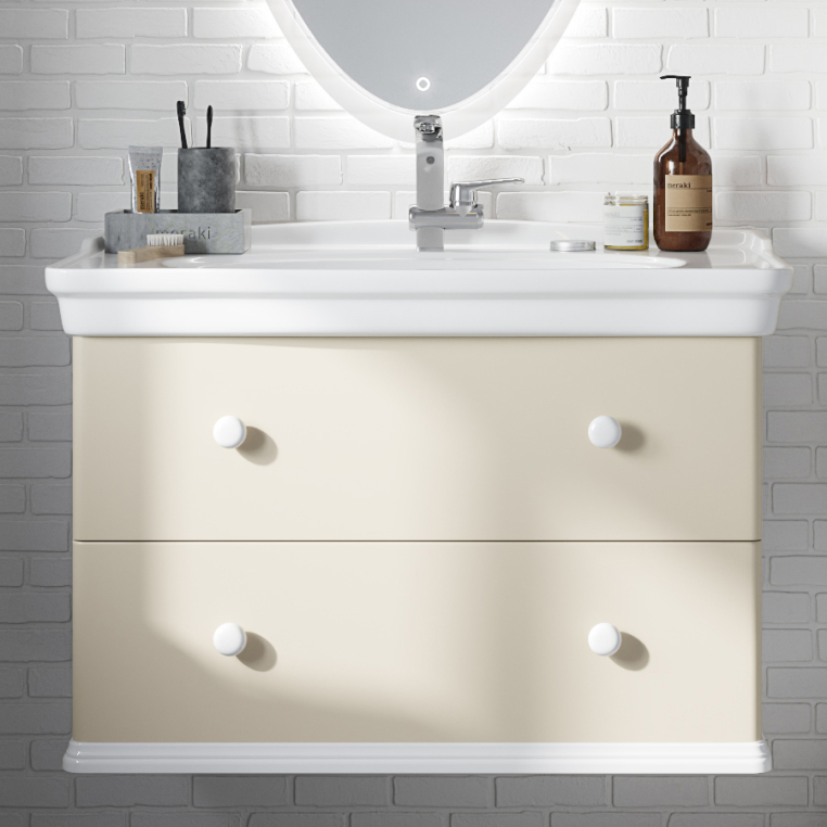 Мебель для ваннойStworki «Вестерос 85» дает уникальную возможность создатьнеповторимый интерьер. Сочетание приятных бежевых фасадов и белыхкерамических ручек проводит параллели со стилем американскаяклассика. Акцентом коллекции является элегантное овальное зеркало ссенсором для активации подсветки. Для удобного размещенияхозтоваров и текстиля в тумбе предусмотрена герметичная зонахранения. Фурнитура с доводчиками обеспечит мягкое закрываниеящиков без стуков и заеданий. К тумбе прилагается практичнаяраковина с бортиками, которая поможет расставить необходимыесредства гигиены и не даст воде выплеснуться на пол и мебель. Прижелании комплект можно дополнить подвеснымшкафом-пеналом.