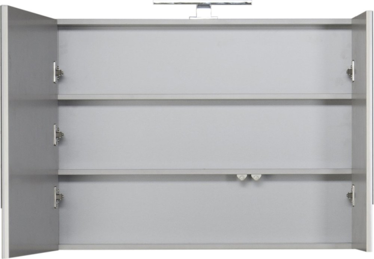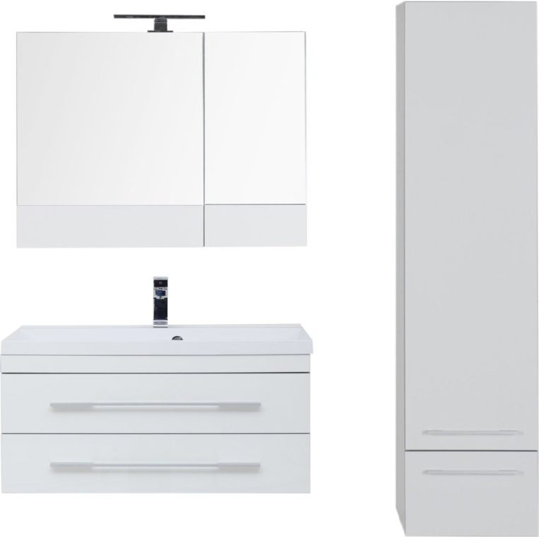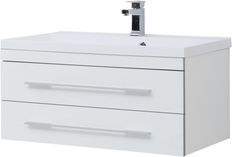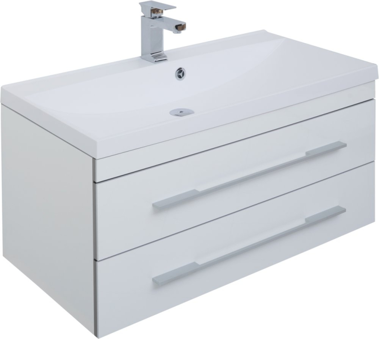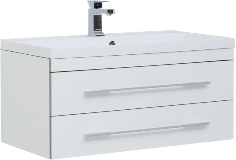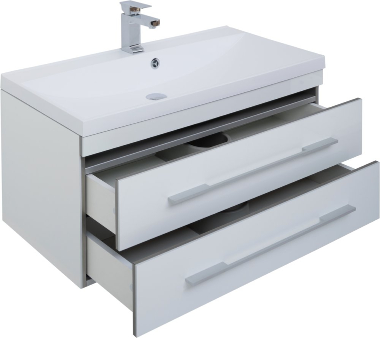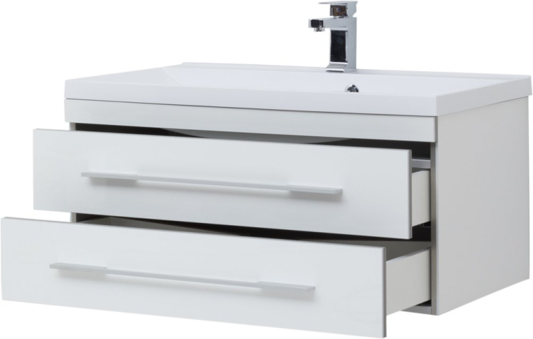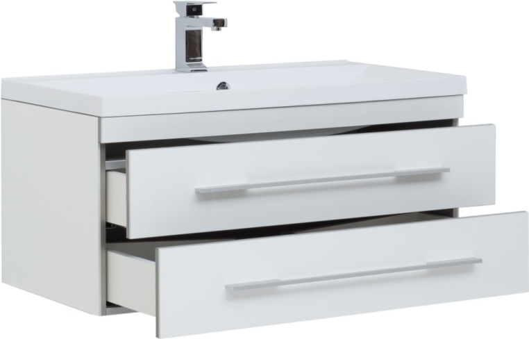 Функциональный гарнитур в стиле модерн отличается практичным и продуманным дизайном. Благодаря простым формам и строгому внешнему виду, этот комплект будет хорошо смотреться в любом интерьере. Нейтральный цвет гарнитура оставляет свободу выбора оттенков и паттернов в отделке – комплект можно сочетать с любыми, даже самыми креативными идеями. Тумба состоит из двух частей – навесной модуль с двумя вместительными ящиками и подвижная часть, являющаяся одновременно местом для хранения и широкой площадкой, которая может использоваться как подставка или даже сиденье. Позади зеркала скрывается компактный шкафчик, где будет удобно хранить гигиенические средства