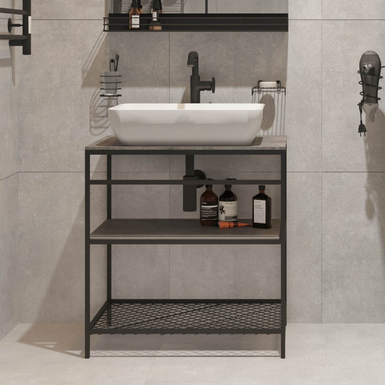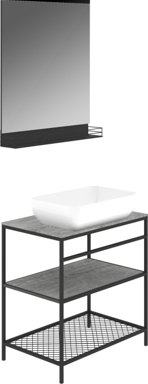 Мебель для ванной STWORKI «Нюборг 70» поможет создать идеальный монохромный интерьер. Обилие металла, темный цвет и открытые пространства характерны для смелого стиля лофт. Вместо тумбы представлена напольная двухъярусная консоль, где можно разместить не только гигиенические средства, но и текстиль. Конструкция стальная, эмалированная — это гарантирует повышенную устойчивость к пару, брызгам и конденсату. В том же стиле оформлено черное прямоугольное зеркало с полкой. Ограничители по краям полки защитят флаконы от случайного падения. Белая накладная раковина из полимерной керамики устанавливается на столешницу из влагостойкой ЛДСП. Гарнитур может быть дополнен открытым шкафом-пеналом и минималистичными аксессуарами.