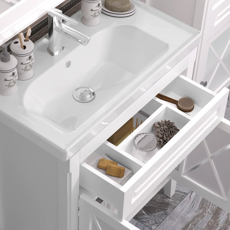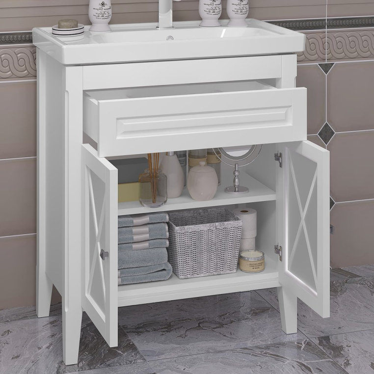Классический комплект «Палермо» выполнен в современном стиле. Гарнитур характеризуется строгостью линий и четкой геометрией, которая проявляется в оформлении матовых стеклянных фасадов. В комплект входят тумба с раковиной, зеркало и шкаф-пенал. Они изготовлены из экологически чистого влагостойкого массива бука. Для сборки используются современные комплектующие, произведенные в соответствии с европейскими стандартами. Тумба оснащена выдвижным ящиком с механизмом push open (открытие от нажатия) и дверцами с интегрированными доводчиками. В состав набора входит навесное зеркало в раме с декоративным карнизом