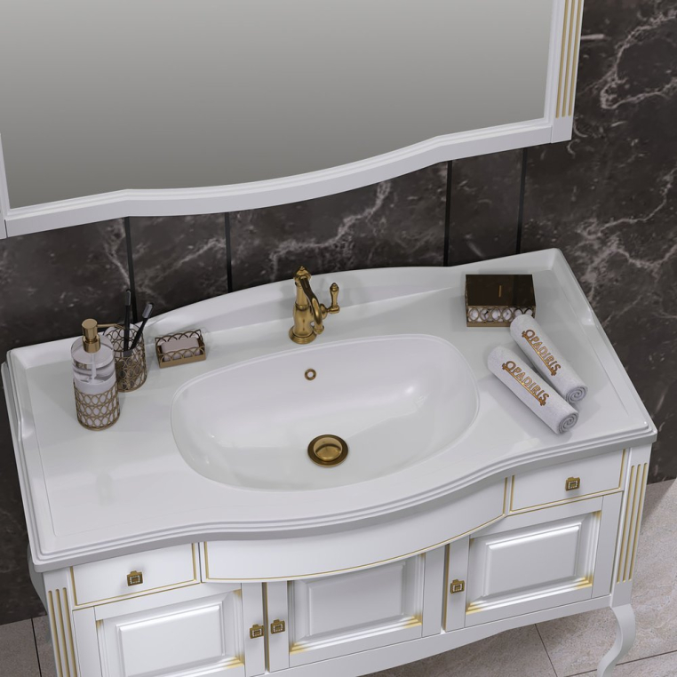 Комплект «Лаура» – символ роскоши, воплощенный компанией Opadiris в изысканном классическом стиле. Тумба на высоких изогнутых ножках, входящая в гарнитур, смотрится невесомо за счет белого фасада с патиной. Дополнительный шарм и очарование коллекции придают золотые ручки квадратной формы, инкрустированные кристаллами Swarovski. Мебель не только имеет безукоризненный внешний вид, но и отличается функциональностью. Она выполнена из экологичного массива дерева, подготовленного к долгой эксплуатации в условиях повышенной влажности и перепадов температур. Комплектующие европейского производства гарантируют надежность и долговечность мебели. Внутреннее пространство для хранения организовано с помощью выдвижных ящиков и распашных дверей с интегрированными доводчиками. В комплект также входят прямоугольная раковина из прочного искусственного мрамора и большое подвесное фигурное зеркало в раме