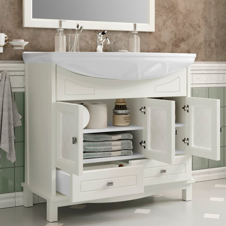 Российский производитель мебели для ванной Opadiris представляет коллекцию «Омега». Она включает в себя тумбу с раковиной, зеркало и пенал в стиле ретро. Набор выполнен в бежевом цвете, оформлен контурной фрезой и имеет рамные фасады с остеклением, имитирующим ромбовидную решетку. Распашные дверцы с доводчиками и выдвижные ящики украшают ручки в цвете состаренного серебра. Для изготовления используются только высококачественные экологичные импортные материалы – МДФ и массив бука со специальным водоотталкивающим матовым покрытием. Тумба укомплектована белой полукруглой керамической раковиной.Зеркало в белой деревянной раме визуально увеличит пространство и наполнит помещение светом