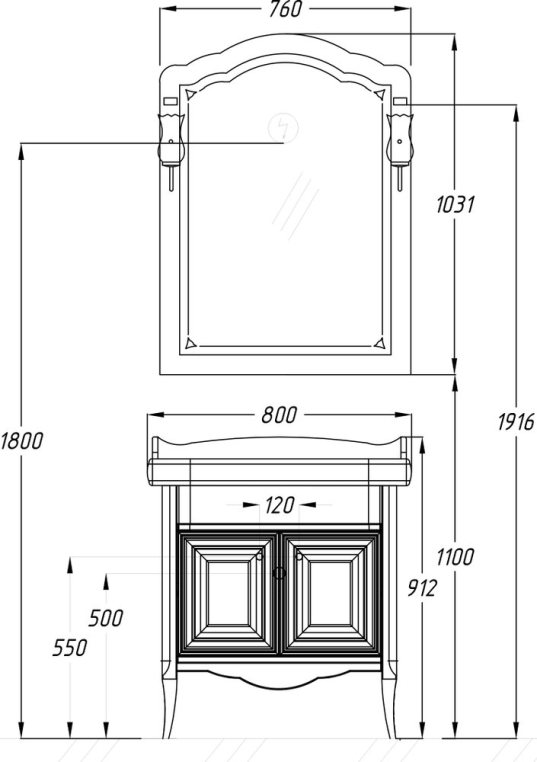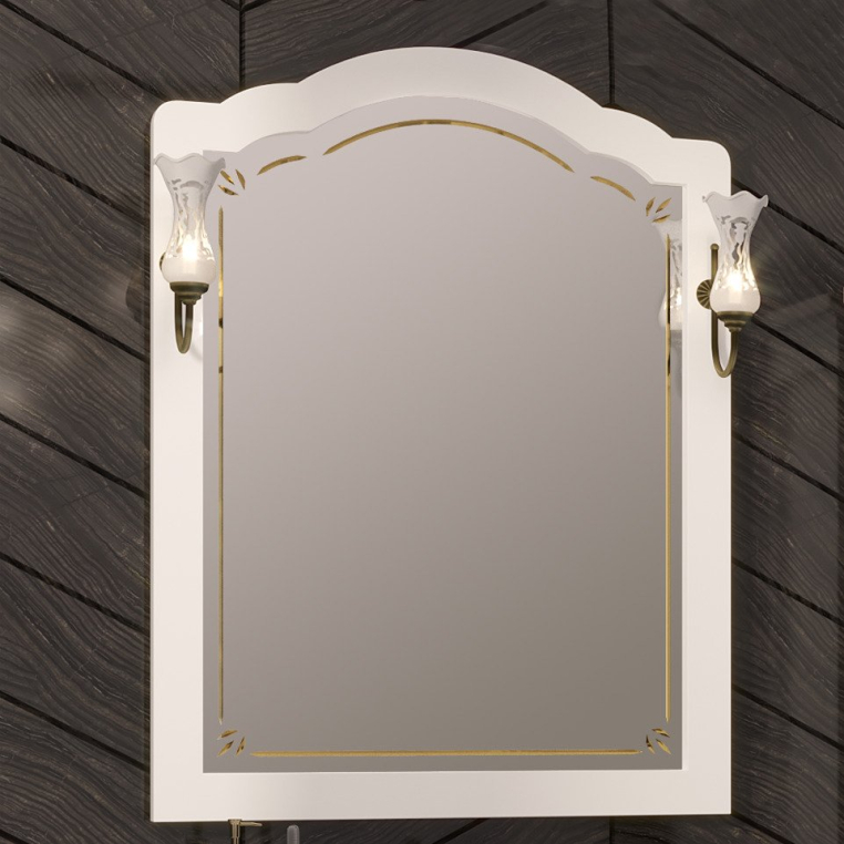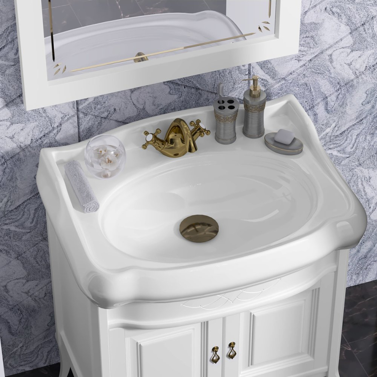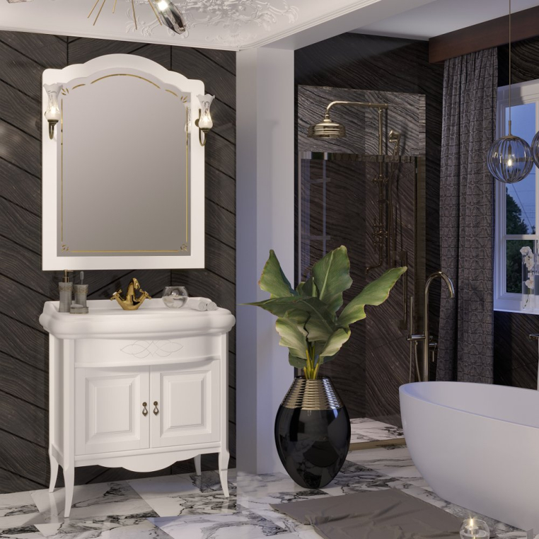 Opadiris «Лоренцо 80» – мебель для классической ванной комнаты стандартных параметров. Отличительные черты гарнитура – изогнутые ножки тумбы, белый матовый фасад с фрезеровкой, винтажные ручки-капли и фигурная раковина. Мебель изготавливается из массива бука и покрывается износостойкой матовой эмалью, раковина выполнена из гигиеничного санфаянса. Качественное зеркальное полотно, оформленное лазерной гравировкой и арочной рамой, можно дополнить элегантными боковыми бра (приобретаются отдельно)