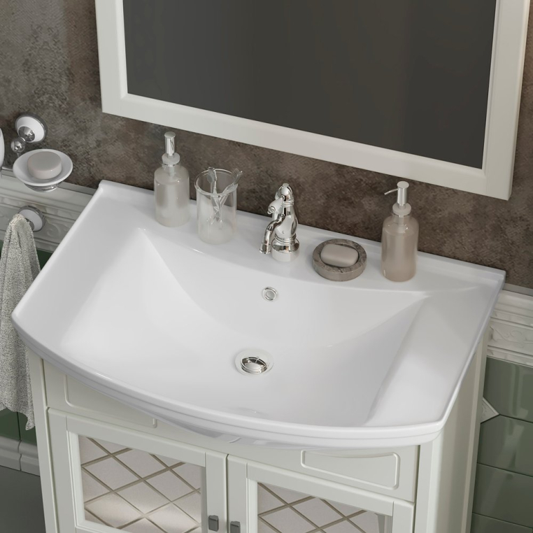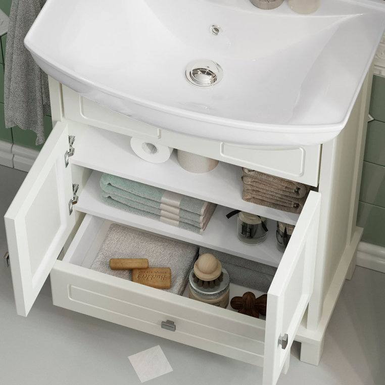 Ценителям интерьеров в стиле ретро российский производитель Opadiris предлагает комплект «Омега». Коллекция состоит из тумбы с раковиной и зеркала. Гарнитур идеально впишется в любой интерьер и при этом будет практичным и удобным в использовании. Фасад выполнен с применением технологии фрезерования. Распашные двери остеклены матовыми витражами с красивой ромбовидной гравировкой. Ручки в цвете состаренного серебра сделают обстановку элегантной и неповторимой. Мебель характеризуется как прочная и долговечная.Для достижения таких эксплуатационных качеств производитель использует материалы, прошедшие специальную обработку, и комплектующие, соответствующие строгим европейским стандартам. Интегрированные доводчики обеспечивают плавное закрывание дверей и выдвижных ящиков. Тумба укомплектована белой полукруглой раковиной из практичного фаянса. Большое прямоугольное зеркало в простой деревянной раме визуально увеличит помещение