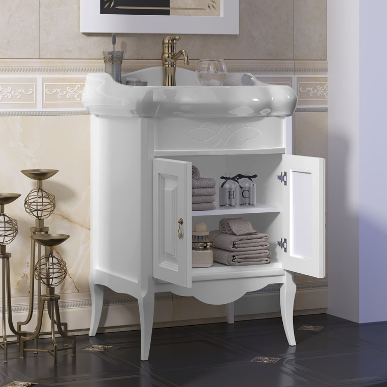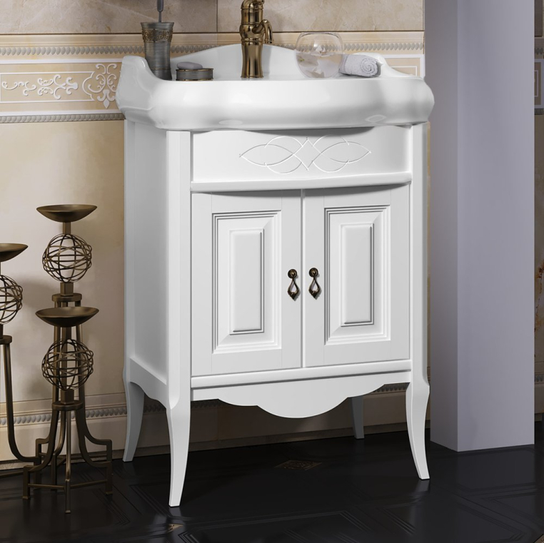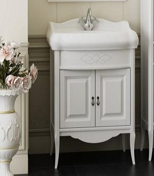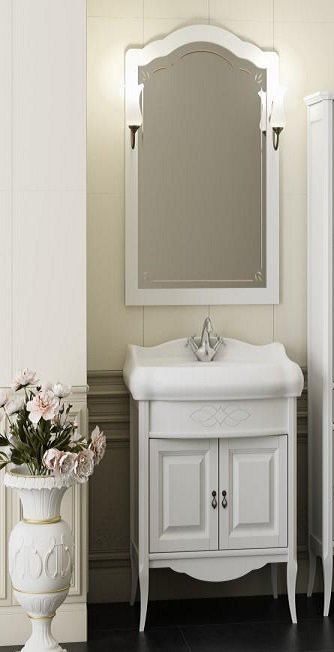 Специально для владельцев малогабаритных ванных комнат, желающих создать респектабельный интерьер в стиле ретро, российский производитель Opadiris представляет комплект «Лоренцо» шириной 60 см. Он включает в себя тумбу с раковиной и зеркало. Использование массива бука для изготовления мебели позволило сделать ее по-настоящему добротной и красивой. Филенчатый фасад с фрезеровкой, винтажные ручки в форме капли под бронзу, изящные изогнутые ножки, лазерная гравировка с утонченным рисунком на зеркале – все это придаст ванной комнате аристократичный и респектабельный вид. Поверхности покрыты белой матовой эмалью, защищающей материал от воздействия влажной среды и предохраняющей от механических повреждений. При сборке производитель использует только европейские комплектующие, соответствующие самым строгим стандартам качества. Это позволяет ему предоставлять гарантию на мебель на пять лет. В комплект входит полукруглая керамическая раковина с глубокой чашей и высокими бортами