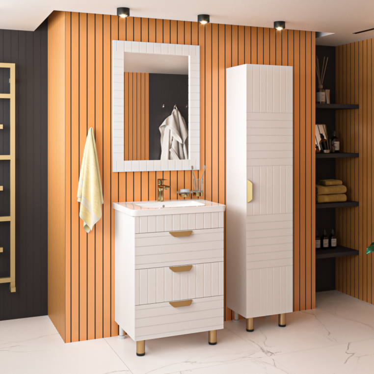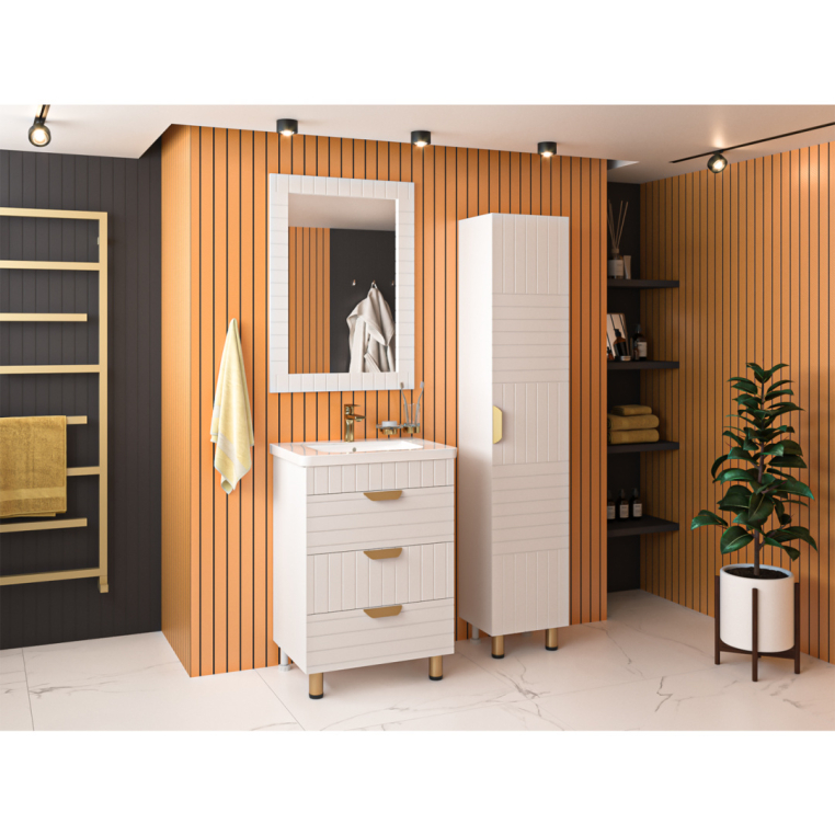 НА ФАСАДАХ МЕБЕЛИ В ЭТОЙ КОЛЛЕКЦИИ ФРЕЗЫ ПЕРПЕНДИКУЛЯРНО ЧЕРЕДУЮТ СВОЁ НАПРАВЛЕНИЕ, А УДОБНЫЕ ЗОЛОТЫЕ РУЧКИ НА ЯЩИКАХ ТУМБЫ, подчёркивают оригинальный СТИЛЬ модели