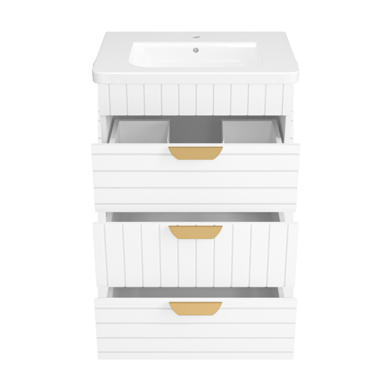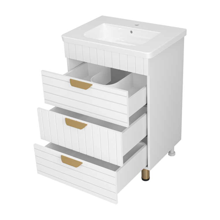 Тумбы под умывальник Бревита Глостер выпускаются в трех популярных типоразмерах – 60, 70 и 80 см ширины. Вне зависимости от габаритов, каждая тумба оснащена тремя выдвижными ящиками с доводчиком на направляющих скрытого монтажа.