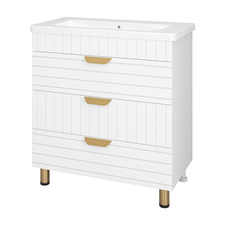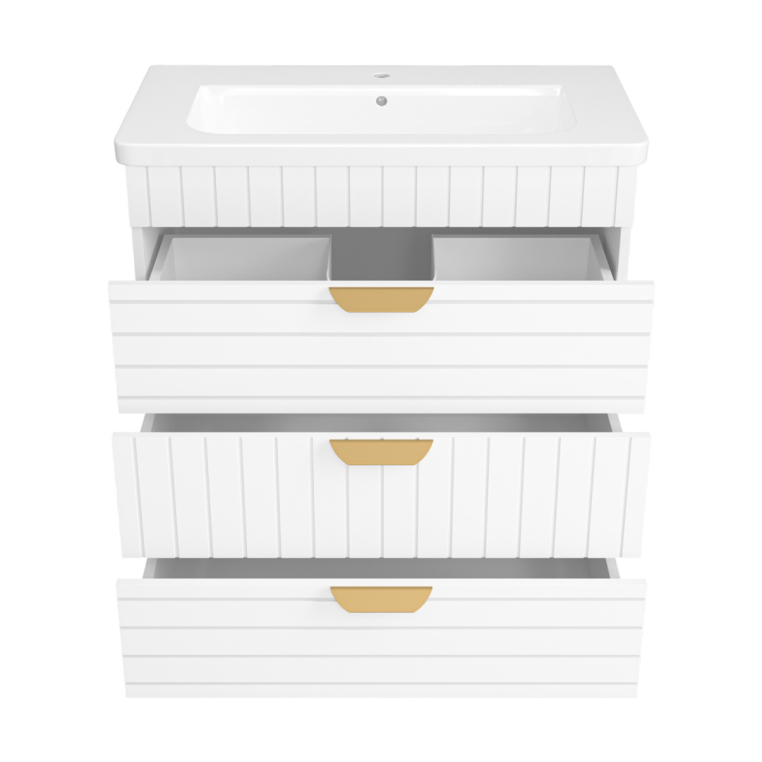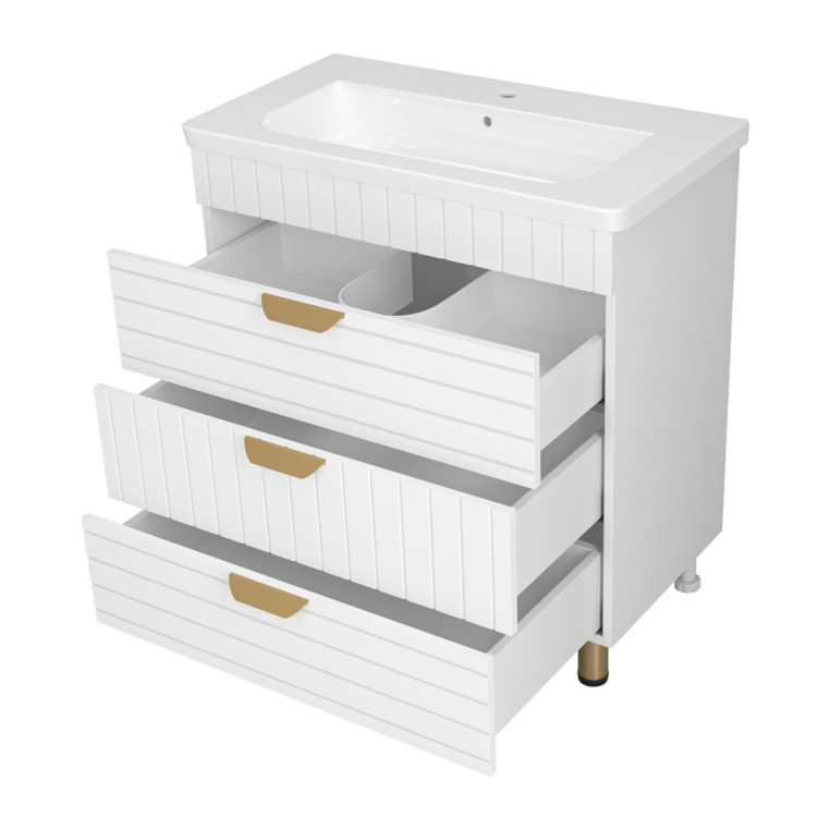 Тумбы под умывальник Бревита Глостер выпускаются в трех популярных типоразмерах – 60, 70 и 80 см ширины. Вне зависимости от габаритов, каждая тумба оснащена тремя выдвижными ящиками с доводчиком на направляющих скрытого монтажа.