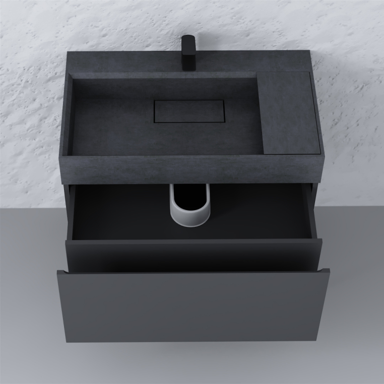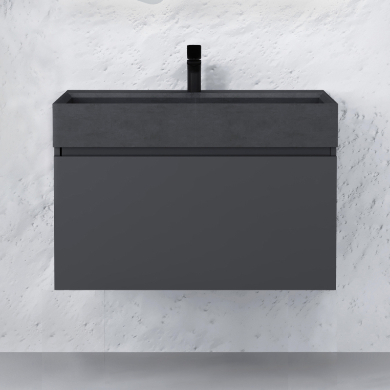 Тумбы коллекции выполнены из МДФ в пленке ПВХ цвета антрацит. Комплекты коллекции оснащены раковинами из бетона