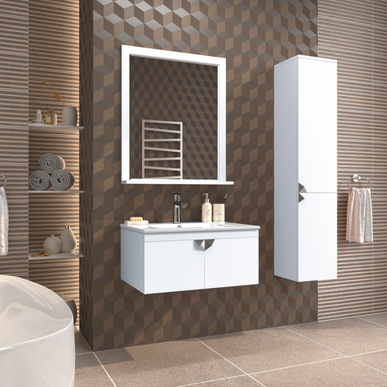 Пенал имеет традиционную конструкцию с отдельными нишами для хранения халатов, полотенец и других банных принадлежностей. В качестве материала корпуса используется ЛДСП, а фасады изготавливают из МДФ с эмалевым покрытием. Этот материал обладает повышенной влагостойкостью, а также длительное время сохраняет свою расцветку и стильный внешний вид. Петли с доводчиками на всех дверцах обеспечивают плавное закрывание фасадов.