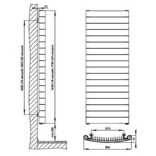 Вертикальный радиатор Rifar Convex 500 - 22 секции нижнее разнесенное подключение