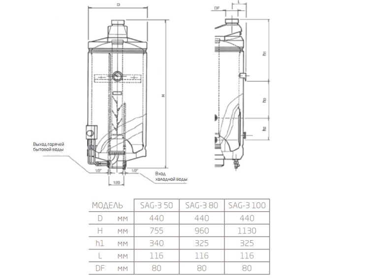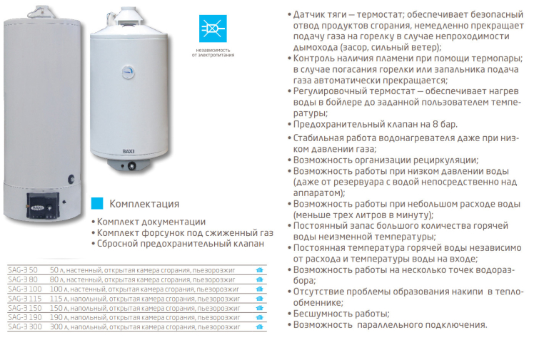 Емкостной водонагреватель газовый накопительный BAXI SAG-3 150 Т подходит как для бытового, так и промышленного использования. Применяется для нагрева холодной воды для системы горячего водоснабжения. Данное оборудование хорошо подходит при замене газовой колонки. В отличие от последней, газовый водонагреватель отличается стабильностью работы даже при низком давлении газа. Водонагреватель BAXI SAG-3 позволяет организовать рециркуляцию горячей воды, может работать при низком давлении воды (даже от резервуара с водой непосредственно над аппаратом) и небольшом расходе воды (меньше 3 литров в минуту). Накопительный водонагреватель обеспечивает постоянный запас большого количества горячей воды неизменной температуры, поддерживает постоянную температуру горячей воды вне зависимости от расхода и температуры воды на входе, способен обеспечить сразу несколько точек водоразбора. Прибор не имеет проблем образования накипи в теплообменнике, отличается бесшумностью работы и имеет возможность параллельного подключения. Газовый накопительный водонагреватель BAXI SAG-3 оснащен открытой камерой сгорания, автономностью работы вне зависимости от электропитания, пьезоэлектрическим розжигом горелки и устройством розжига с пилотным пламенем. Конструктивно водонагреватель состоит из эмалированного стального бака, защищенного от коррозии и образования ржавчины, а также экологически чистой теплоизоляции из пенополиуретана. Прибор оснащен универсальной горелкой из нержавеющей стали, рециркуляционным патрубком ГВС, магниевым анодом для дополнительной защиты от образования ржавчины. Возможно перенастроить газовый водонагреватель для работы на сжиженном газе. В зависимости от объема водонагревателя, предусмотрена либо настенная, либо напольная установка. Водонагреватель BAXI SAG-3 оснащен всеми необходимыми устройствами защиты. Датчик тяги – термостат обеспечивает безопасный отвод продуктов сгорания и немедленно прекращает подачу газа на горелку в случае непроходимости дымохода (засор, сильный ветер). Контроль наличия пламени обеспечивается при помощи термопары – в случае погасания горелки или запальника подача газа автоматически прекращается. Регулировочный термостат обеспечивает нагрев воды в бойлере до заданной пользователем температуры. В комплект поставки также входит предохранительный клапан на 8 бар. Основные характеристики: Страна Италия Производитель BAXI Серия и модель SAG-3 150 T Категория водонагреватель Применение система ХВС и ГВС, газ – производство горячей воды Вид традиционный (атмосферный) Тип накопительный Способ нагрева газовый Способ монтажа настенный Способ установки вертикальный Число точек водоразбора несколько Технические характеристики: Объем 150 л Максимальная полезная тепловая мощность 7 кВт Максимальная потребляемая тепловая мощность 8.2 кВт Максимальный расход природного газа 0,87 куб.м/ч Максимальный расход сжиженного газа 0,65 кг/ч Диапазон регулирования температуры 40-70 оС Производительность горячей воды (первые 30 мин при Δt=30 оС) 439 л/30 мин Максимальное рабочее давление в сети водоснабжения 0,6 МПа Конструкция: Тип бойлера эмалированная сталь Теплоизоляция да Материал теплоизоляции пенополиуретан Газовая горелка универсальная, из нержавеющей стали Магниевый анод да Рециркуляционный патрубок нет Ф