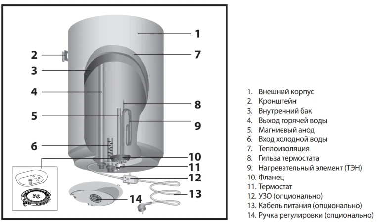Встроенный регулятор температуры позволяет вручную задавать желаемую температуру нагрева воды. А встроенный термостат контролирует температуру нагрева воды внутри бака.