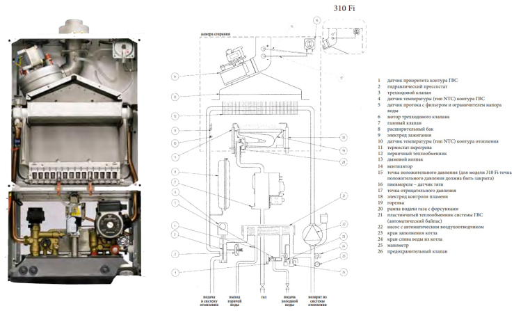 - Встроенный трехходовой клапан для бойлера (без сервопривода) в одноконтурных моделях.