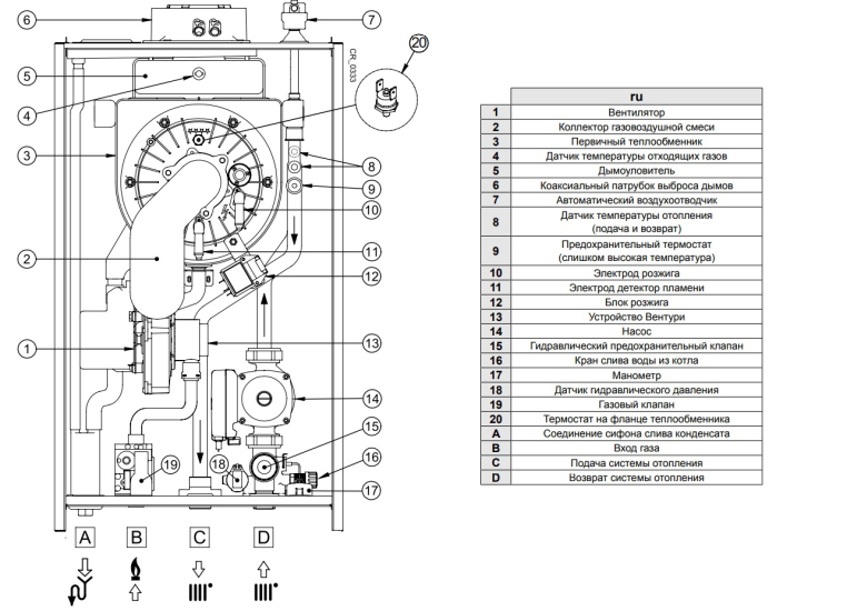 - Предохранительный клапан в контуре отопления (3 атм.);