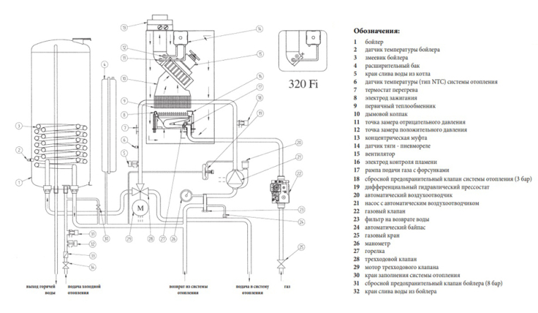 - Предохранительные клапаны в контуре отопления (3 бар) и в контуре ГВС (8 бар)